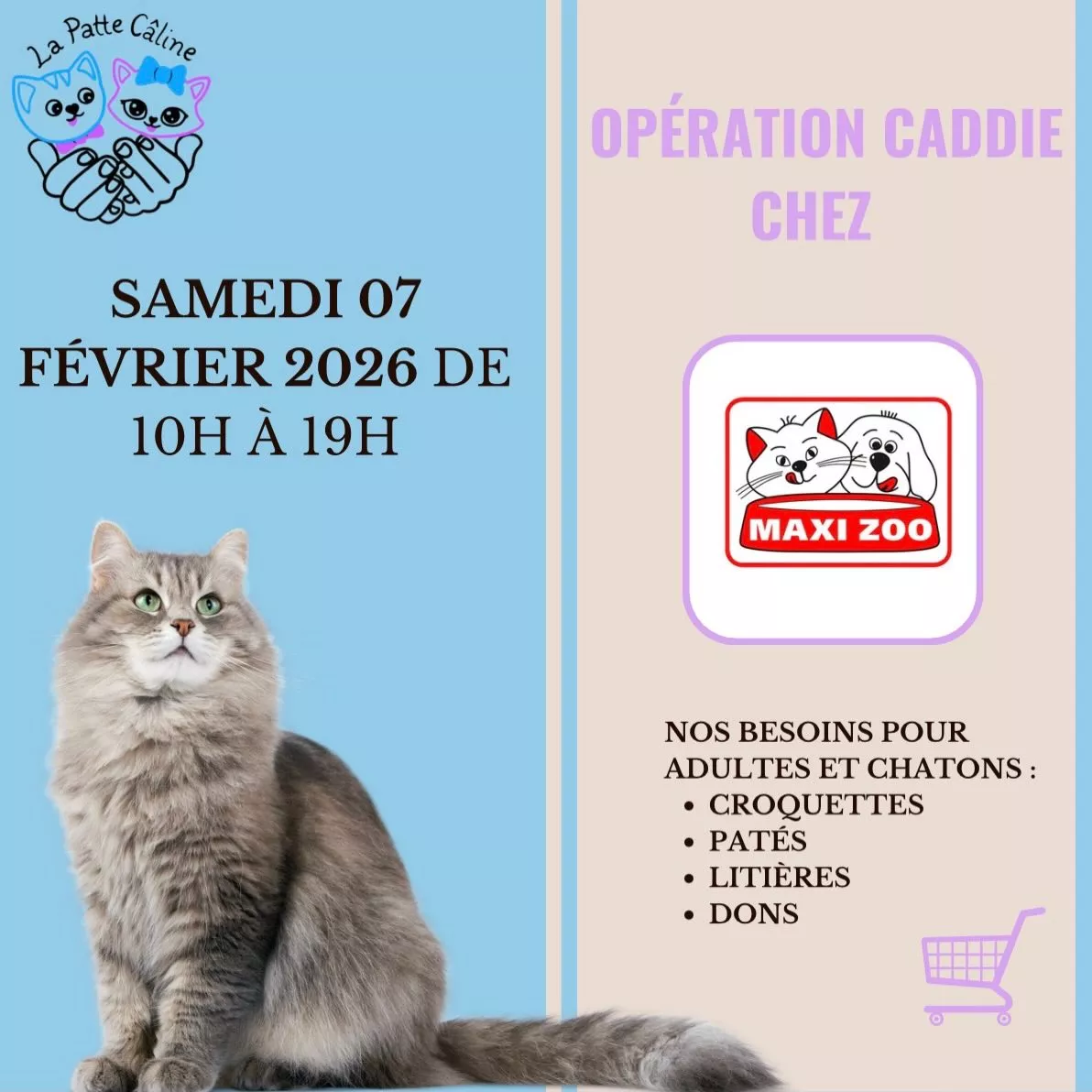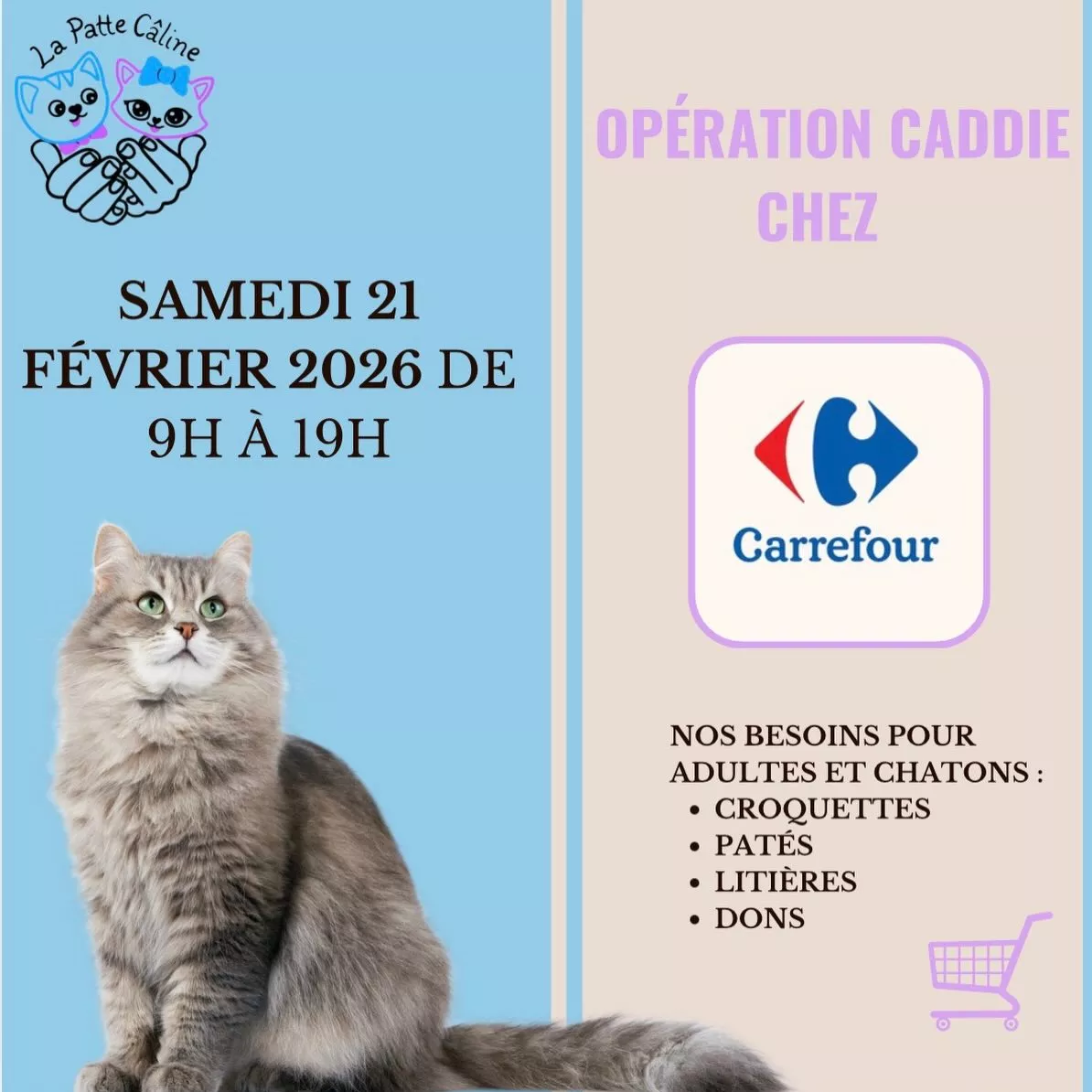 Nous organisons régulièrement des journées de collecte de dons de litière, croquettes, etc... pour nos chats qui sont en famille d'accueil